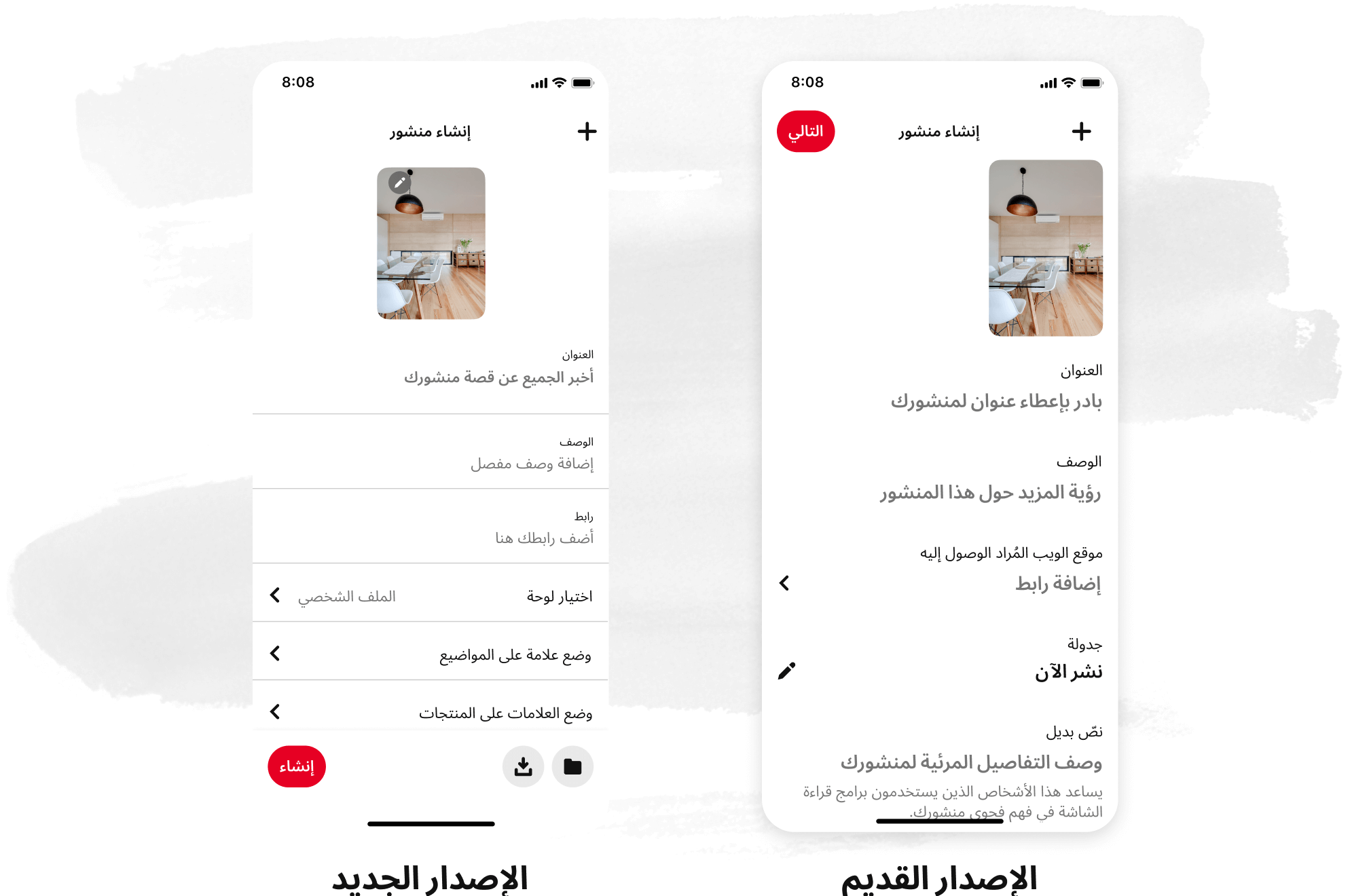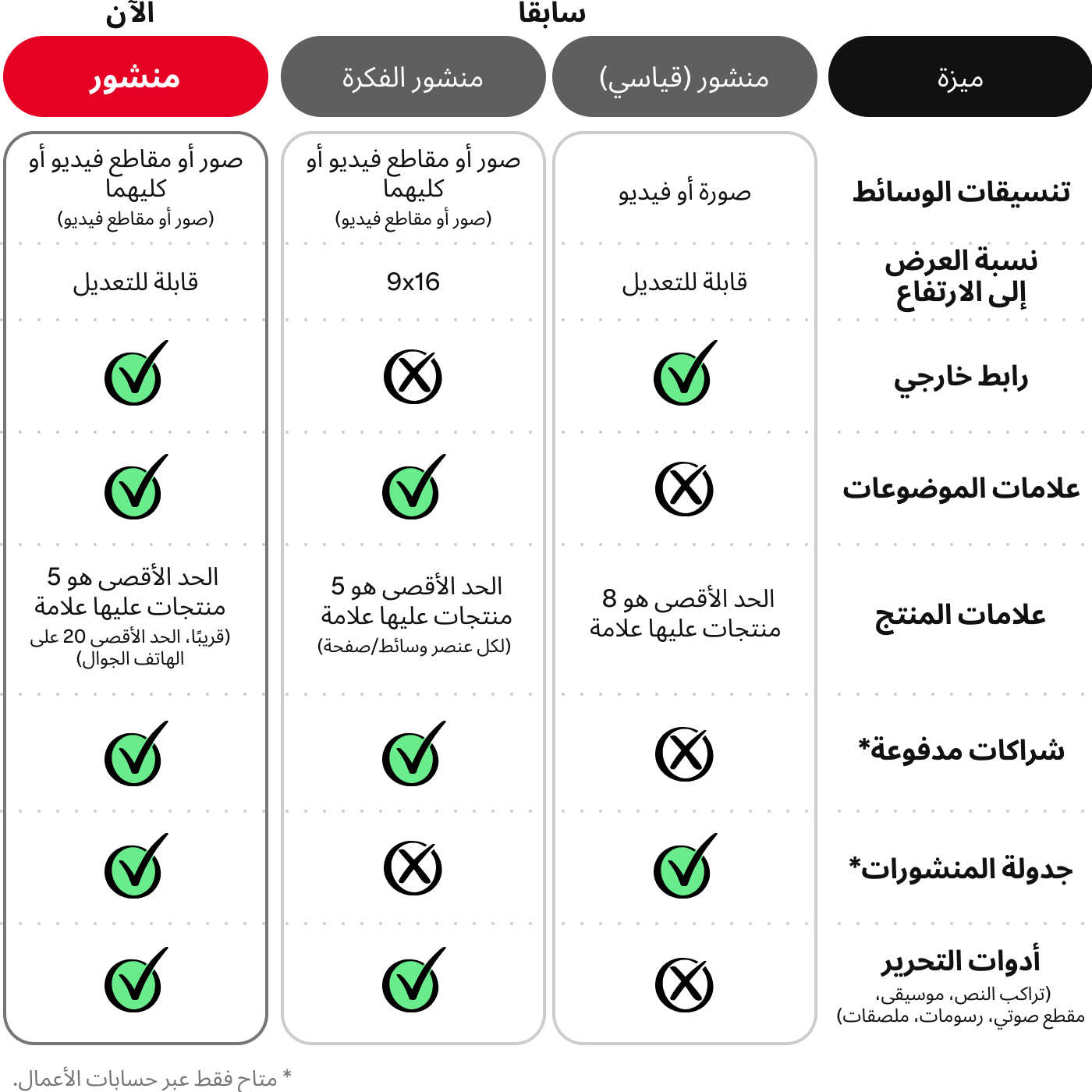 نبحث باستمرار عن طرق لتحسين تجربة الإنشاء الخاصة بك وجعلها أفضل. ومع طريقة أبسط وأسرع لإنشاء المنشورات، إليك مقارنة بين بعض الميزات المفضلة في تنسيقات المنشورات السابقة وتلك الموجودة في التنسيق المحدَّث.