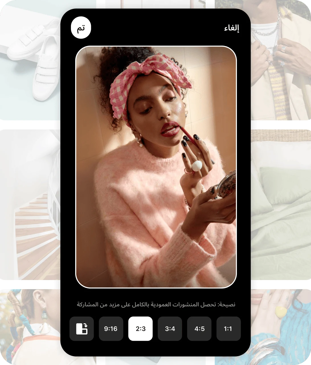 المنشورات تتسع للصور والفيديوهات بمقاسات عرض متعددة، ما يمنح محتواك مدى أوسع وانتشارًا أكبر. باستخدام أداة تغيير الحجم المرنة، يمكنك بسهولة قص محتواك الجديد أو الحالي ليناسب الأبعاد التالية: 9:16، 2:3، 3:4، 4:5، و1:1. بهذه الطريقة، يمكنك إعادة استخدام وإحياء حتى المحتوى الموجود لديك مسبقًا وتحويله إلى منشور جذاب.