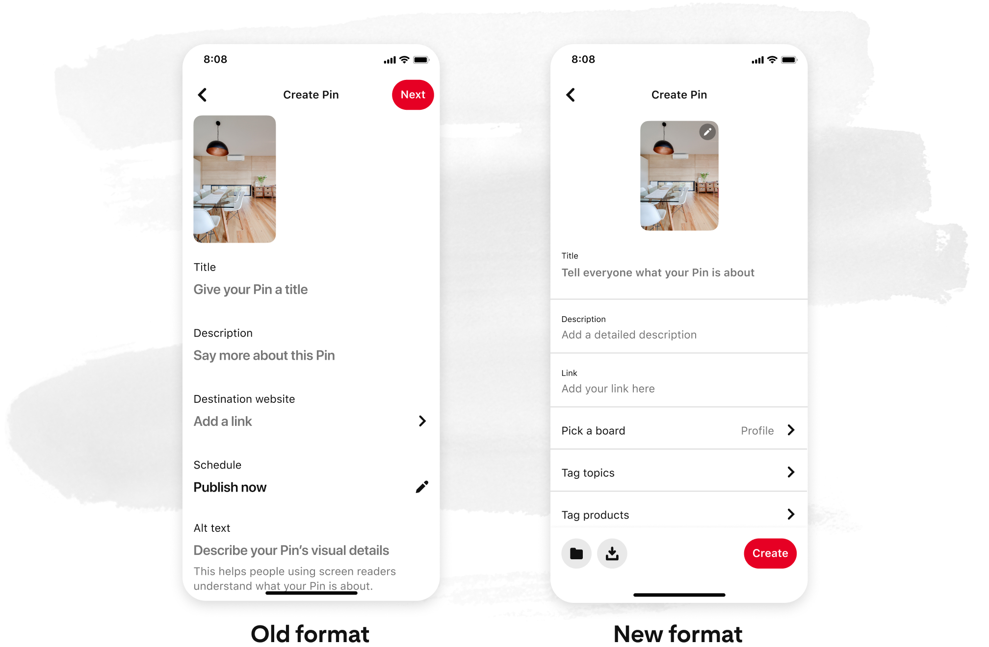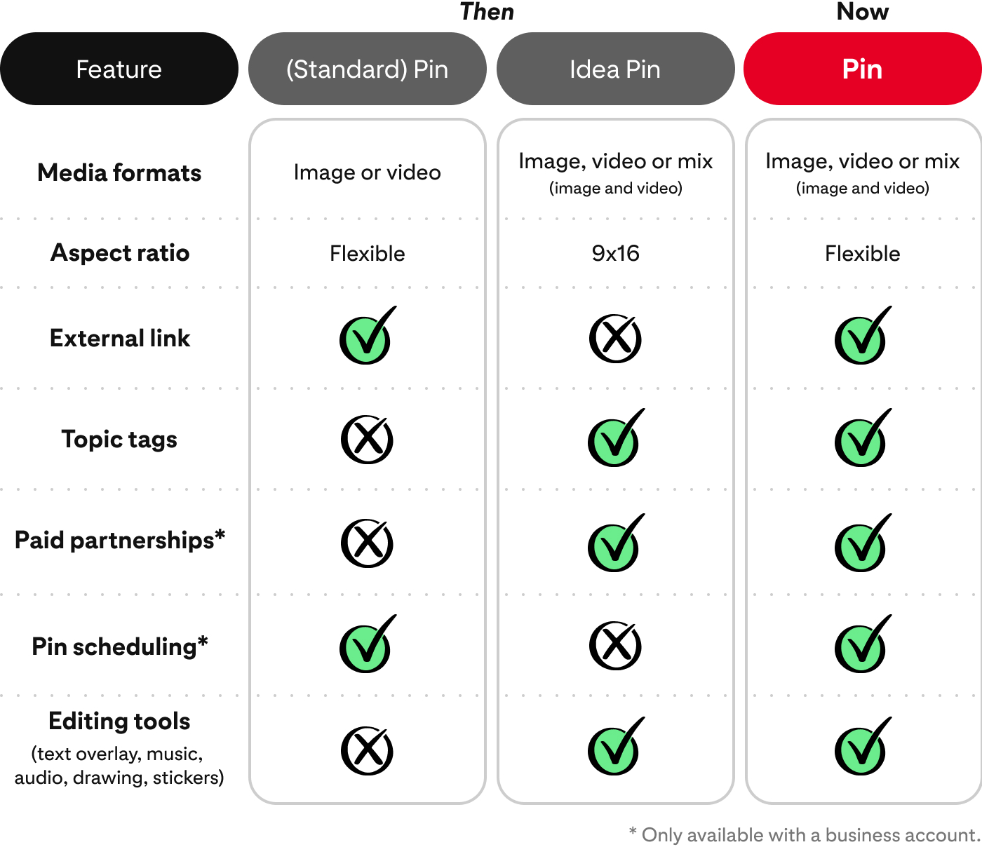 We’re always looking for ways to make a better creation experience for you. And with a simpler, faster way to create, here’s how some favorite features from previous Pin formats stack up against the updated Pin.