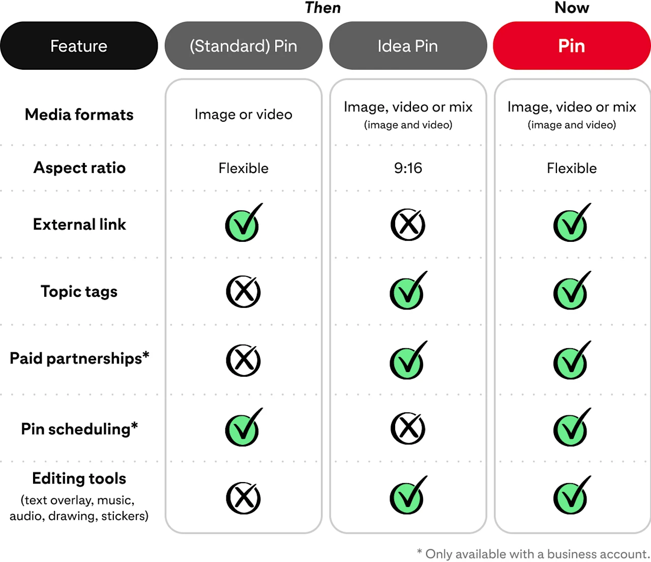 We’re always looking for ways to make a better creation experience for you. And with a simpler, faster way to create, here’s how some favorite features from previous Pin formats stack up against the updated Pin.