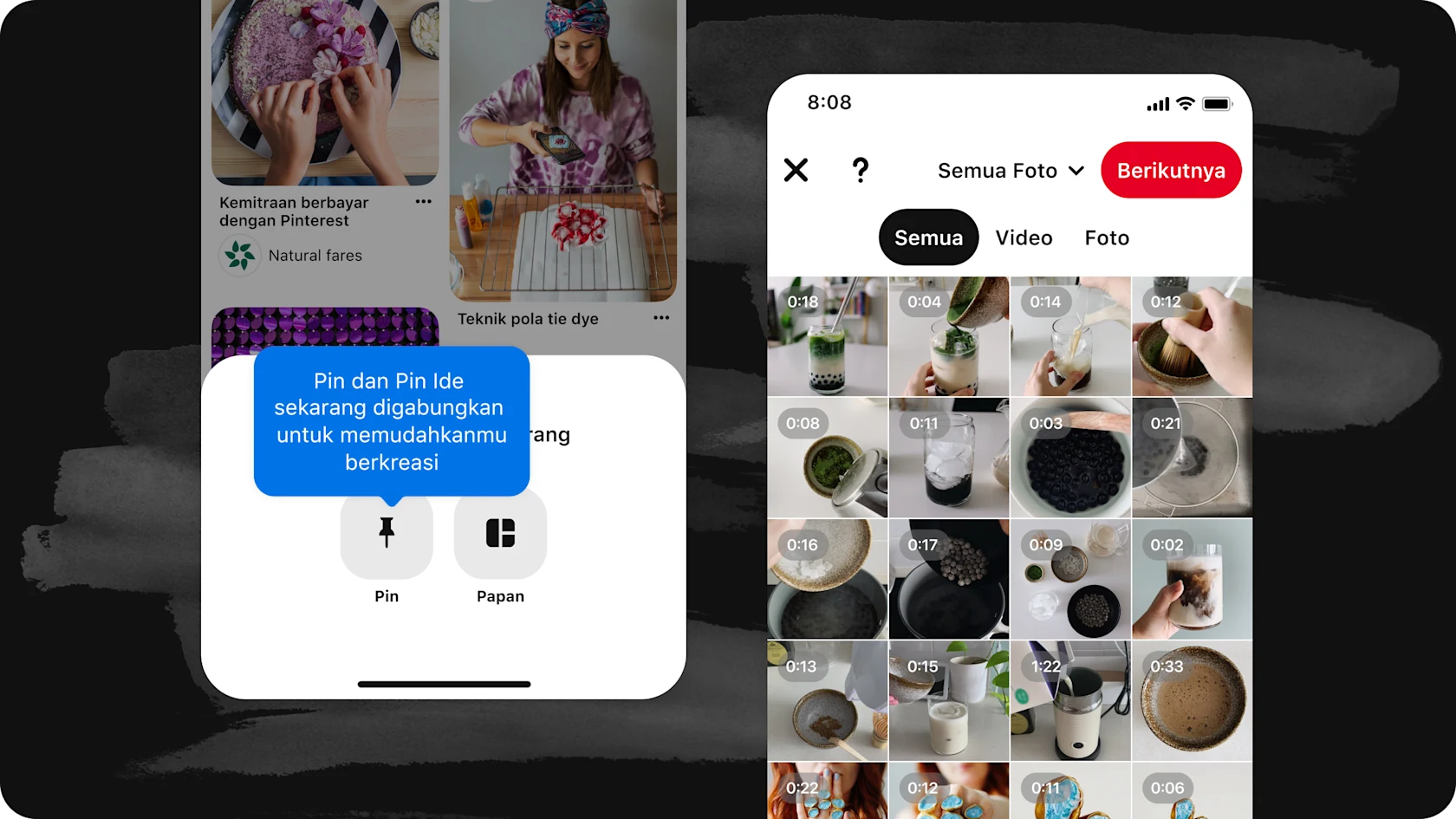 Pin adalah inti dari Pinterest. Selama bertahun-tahun, format konten fleksibel untuk menunjukkan ide-idemu yang menginspirasi dan dapat ditindaklanjuti telah berevolusi untuk memfasilitasi perubahan kebutuhan kreator dan orang-orang di Pinterest (halo, Pin Ide).