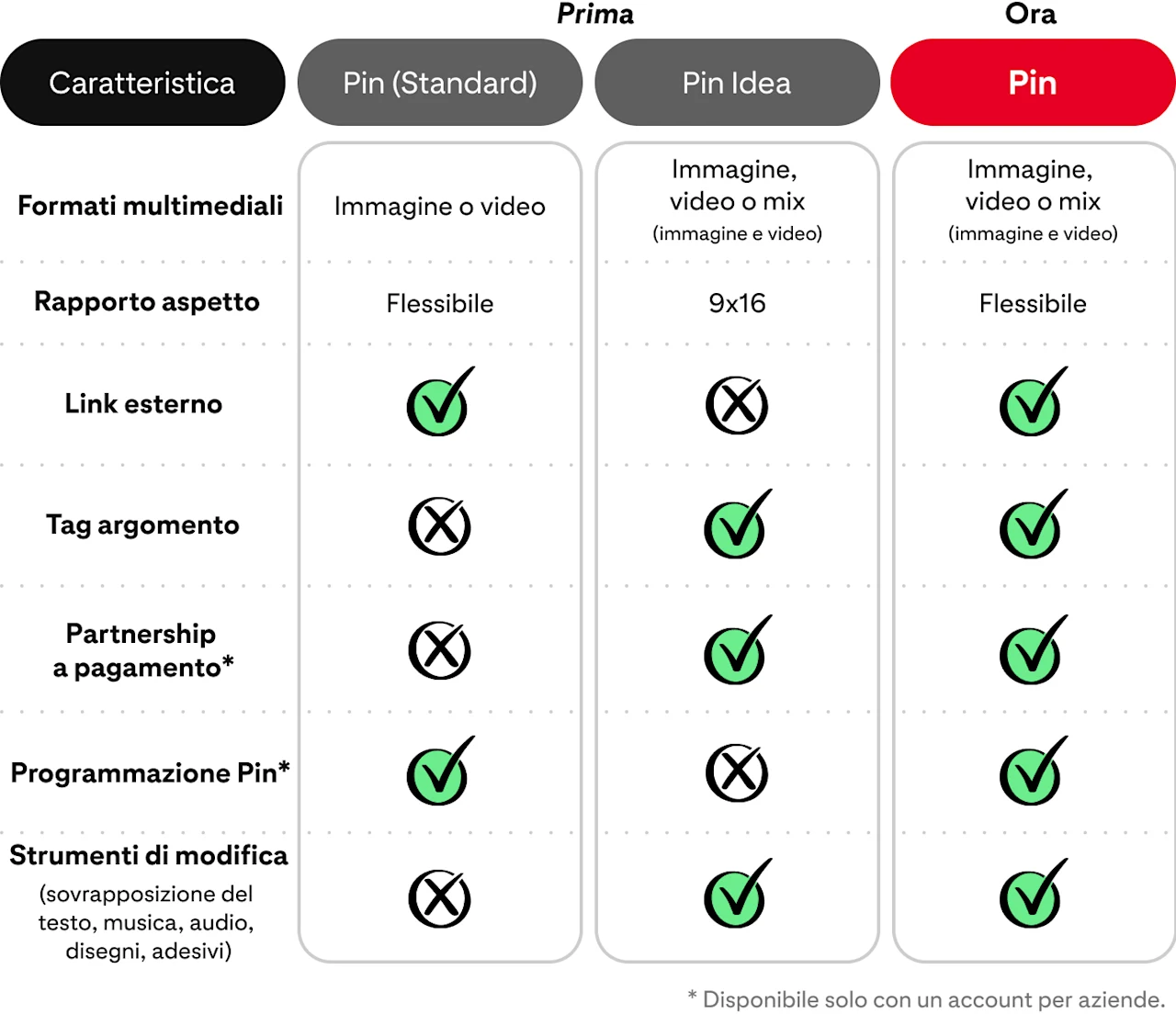 Siamo sempre alla ricerca di idee per migliorare l'esperienza di creazione dei contenuti. Oltre a una modalità più semplice e rapida, ora puoi sfruttare tutte le caratteristiche dei vecchi formati insieme a quelle del nuovo Pin. Eccole a confronto.