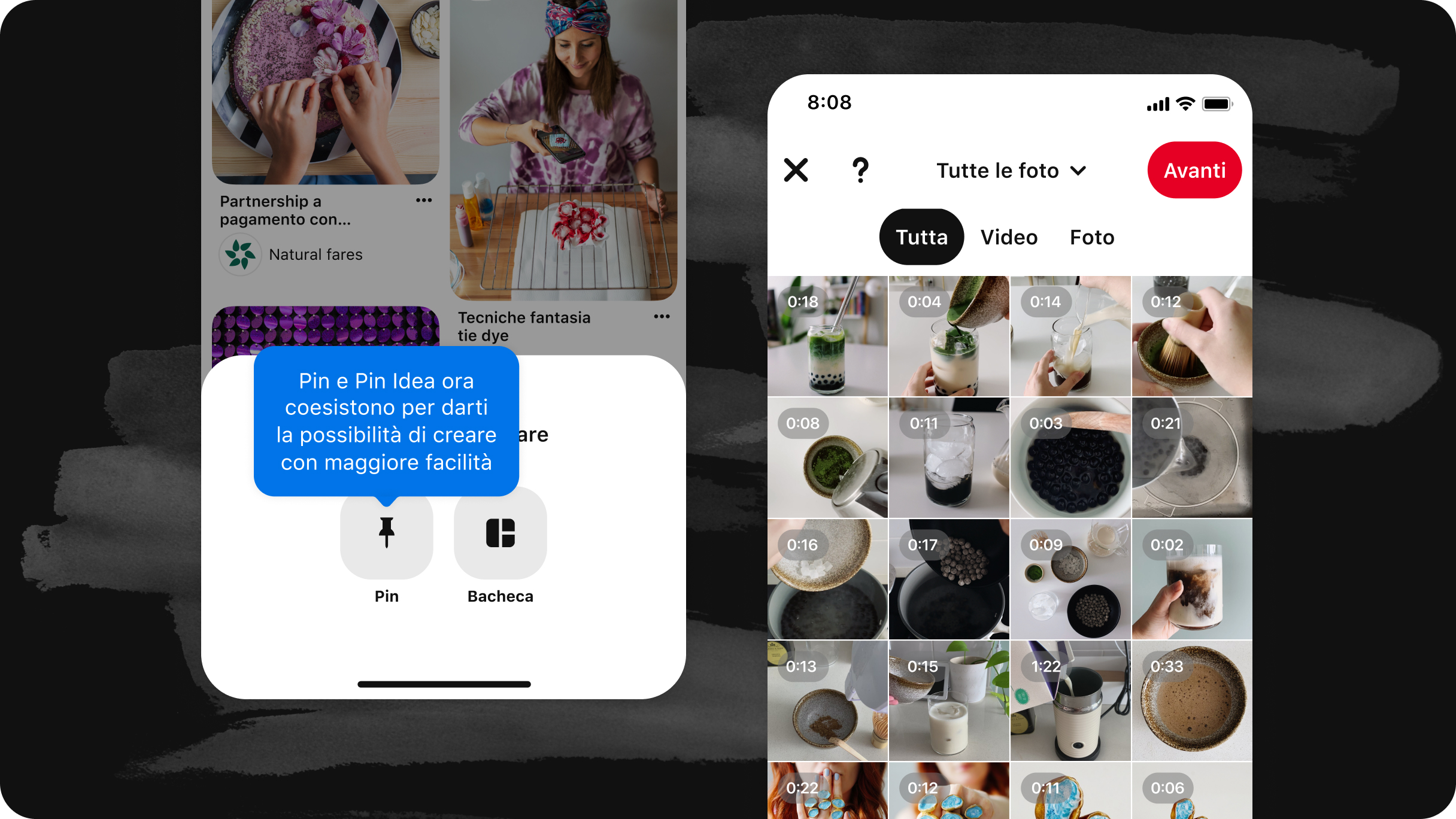 Avrai ancora accesso alle funzionalità che hai usato finora? Puoi scommetterci. Rimuoveremo le caratteristiche che conosci e apprezzi? Assolutamente no. (Per farla breve: otterrai molto di più.) Non importa se preferisci creare contenuti con i Pin Idea multimediali o con quelli standard, come i Pin immagine o video: troverai tutte le tue funzionalità preferite combinate in una sola. Visto che le immagini e i video su Pinterest hanno la stessa diffusione, il bello di questa novità è che puoi concentrarti di più sul contenuto del tuo Pin, senza dover scegliere tra i due formati.