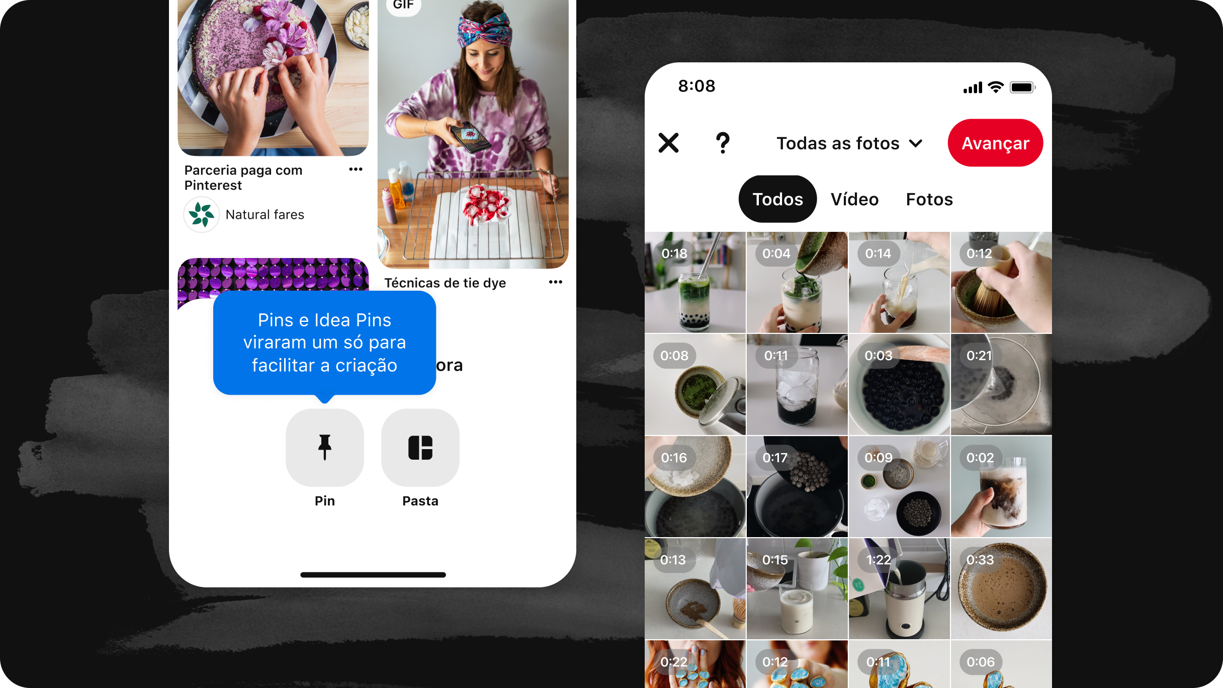 Agora, estamos otimizando o processo de criação para o tornar mais simples e gratificante ao unir o melhor dos Pins padrão e dos Idea Pins em um único formato.