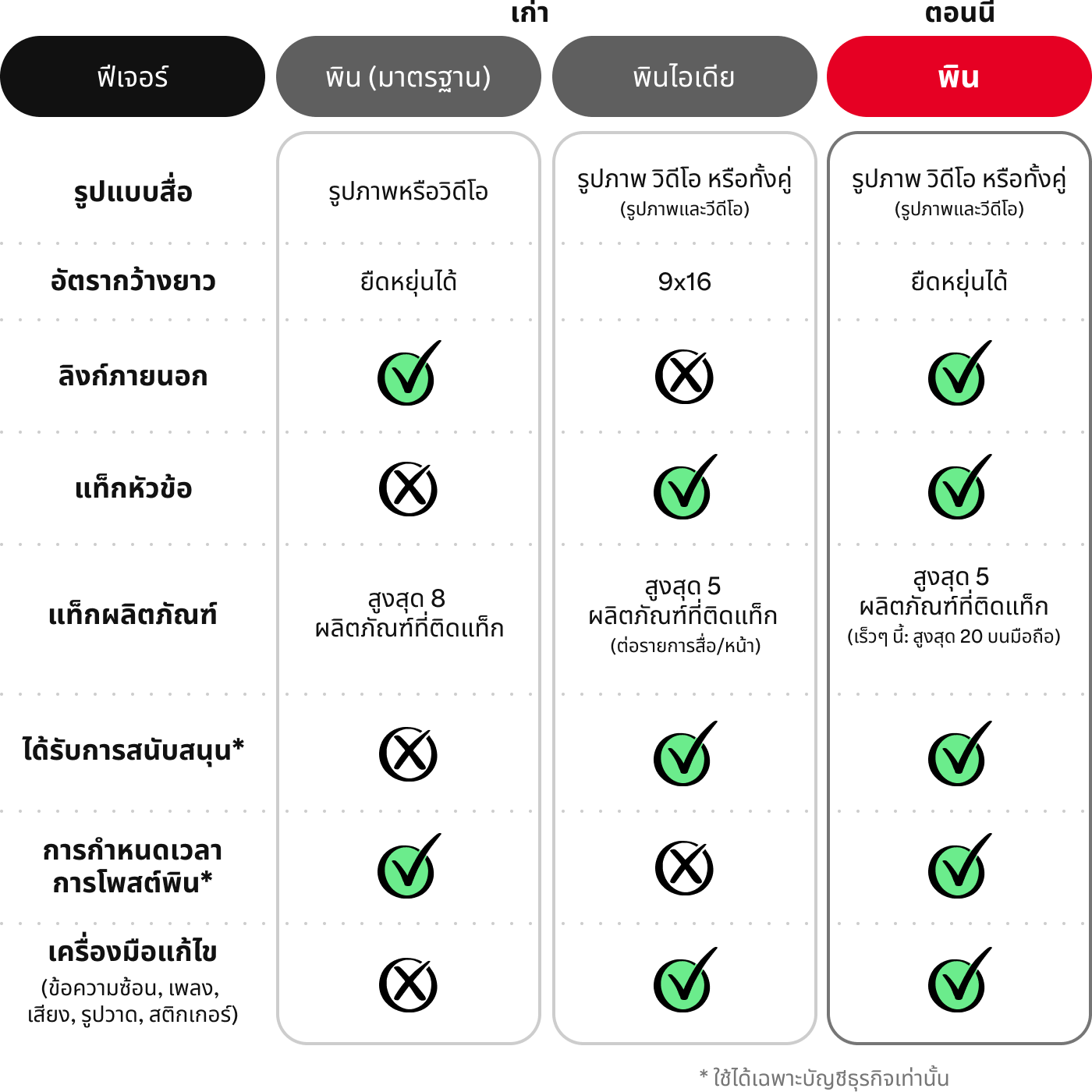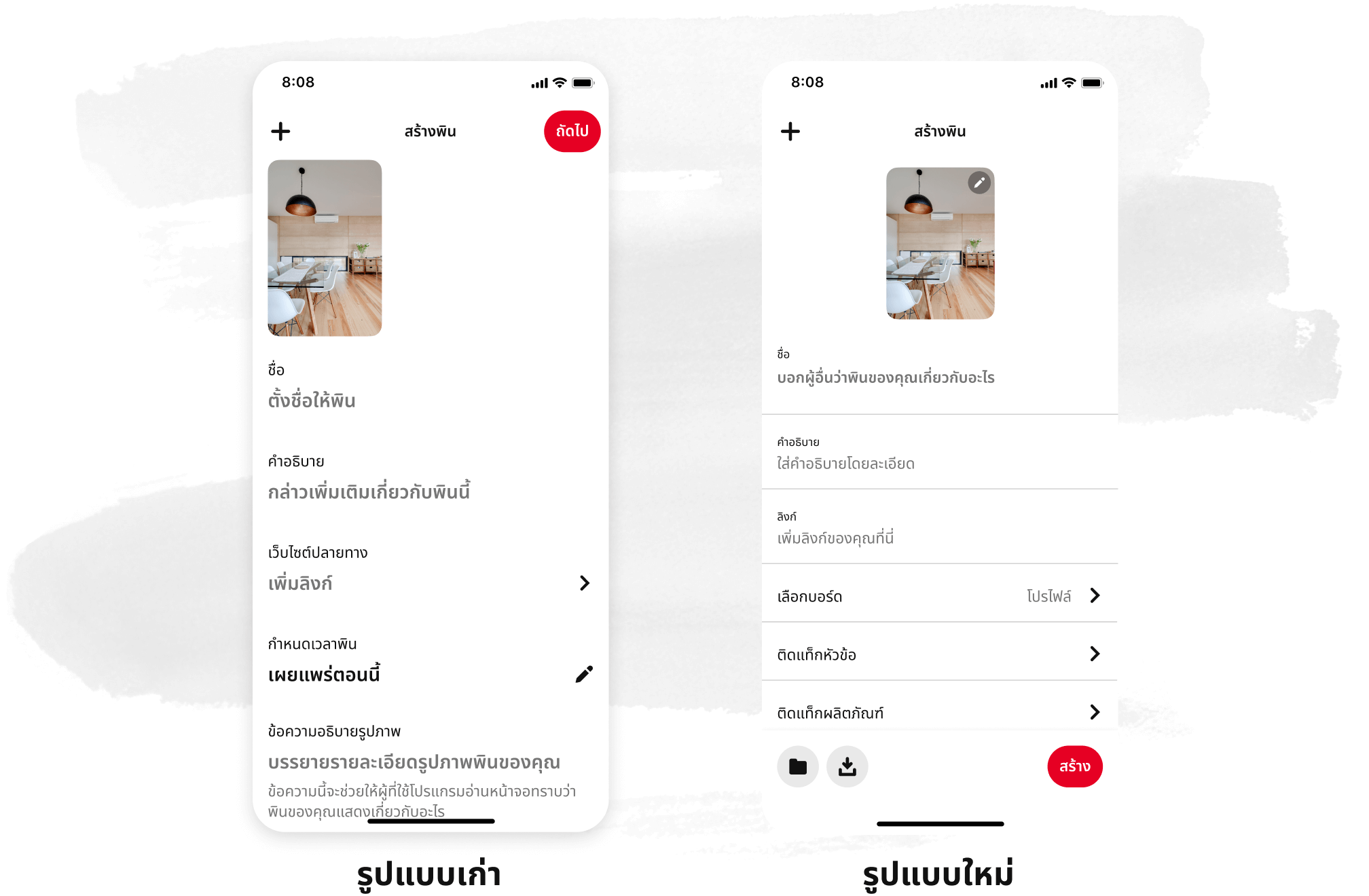 ในส่วนของพินที่คุณได้สร้างสรรค์ไว้ก่อนหน้านี้ ไม่ว่าจะเป็นพินรูปภาพ พินวิดีโอ หรือพินไอเดียล่ะ พินที่คุณมีอยู่จะไม่ได้รับผลกระทบจากการอัปเดต คุณจึงสามารถสร้างสรรค์พินต่อไปได้ในระยะเวลาจำกัด รูปแบบพินใหม่นี้จะเปิดตัวให้กับครีเอเตอร์ทุกคนในอีกไม่กี่เดือนข้างหน้านี้ โปรดคอยติดตามการอัปเดตของคุณ